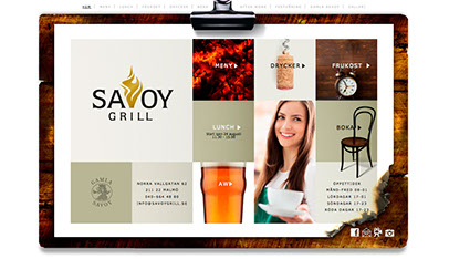 Anrika Savoy Grill återuppstod och med det följde ny logotype, visitkort, brevpapper, hemsida, menyer, annonser, posters m.m.